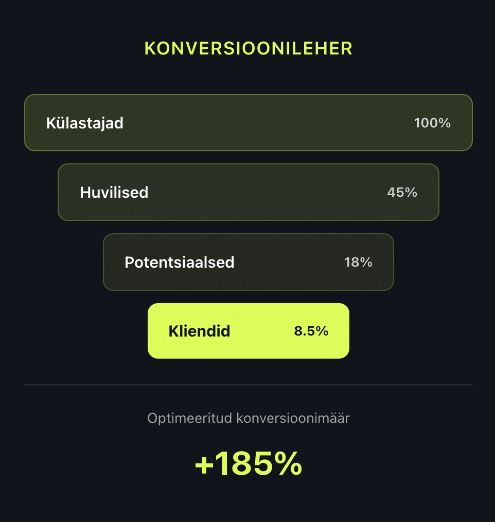 Sama arv külastajaid, aga rohkem oste ja päringuid. Iga lisaprotsent konversiooni tähendab otsest tulu kasvu.